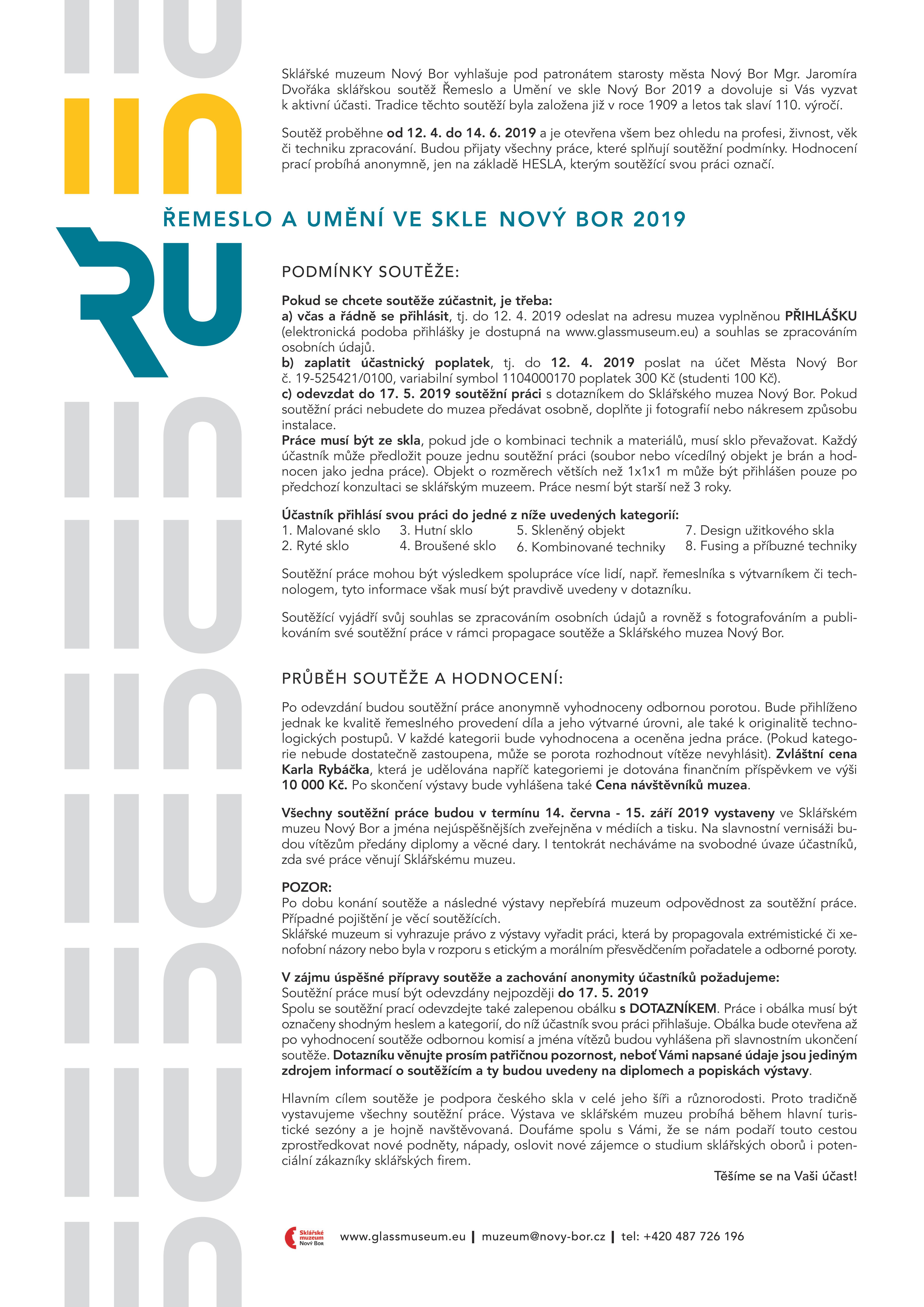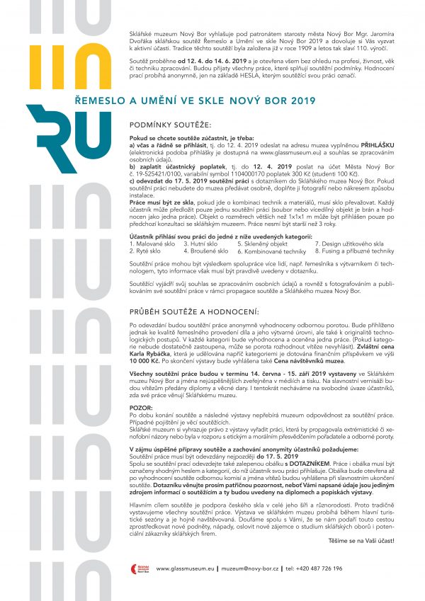 SKLÁŘSKÉ MUZEUM NOVÝ BOR již podesáté vyhlašuje pod patronátem starosty města Nový Bor Mgr. Jaromíra Dvořáka sklářskou soutěž Řemeslo a Umění ve skle Nový Bor a dovoluje si Vás vyzvat k aktivní účasti.